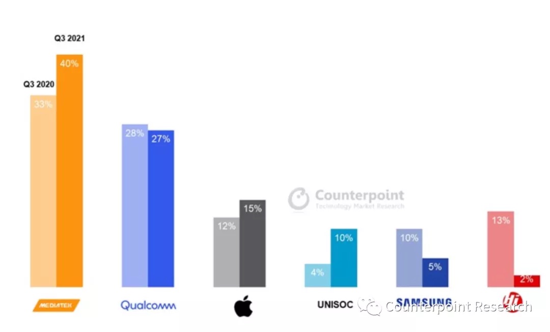 Counterpoint:联发科引领 2021 Q3 智能手机 SoC 出货量