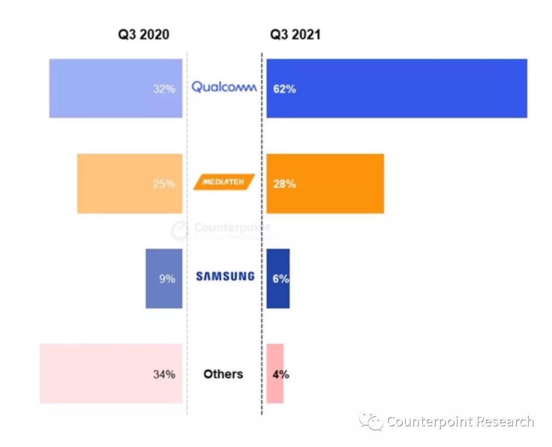 材料来历:Counterpoint Research Quarterly AP/SoC/Baseband Shipments Tracker,2021年12月